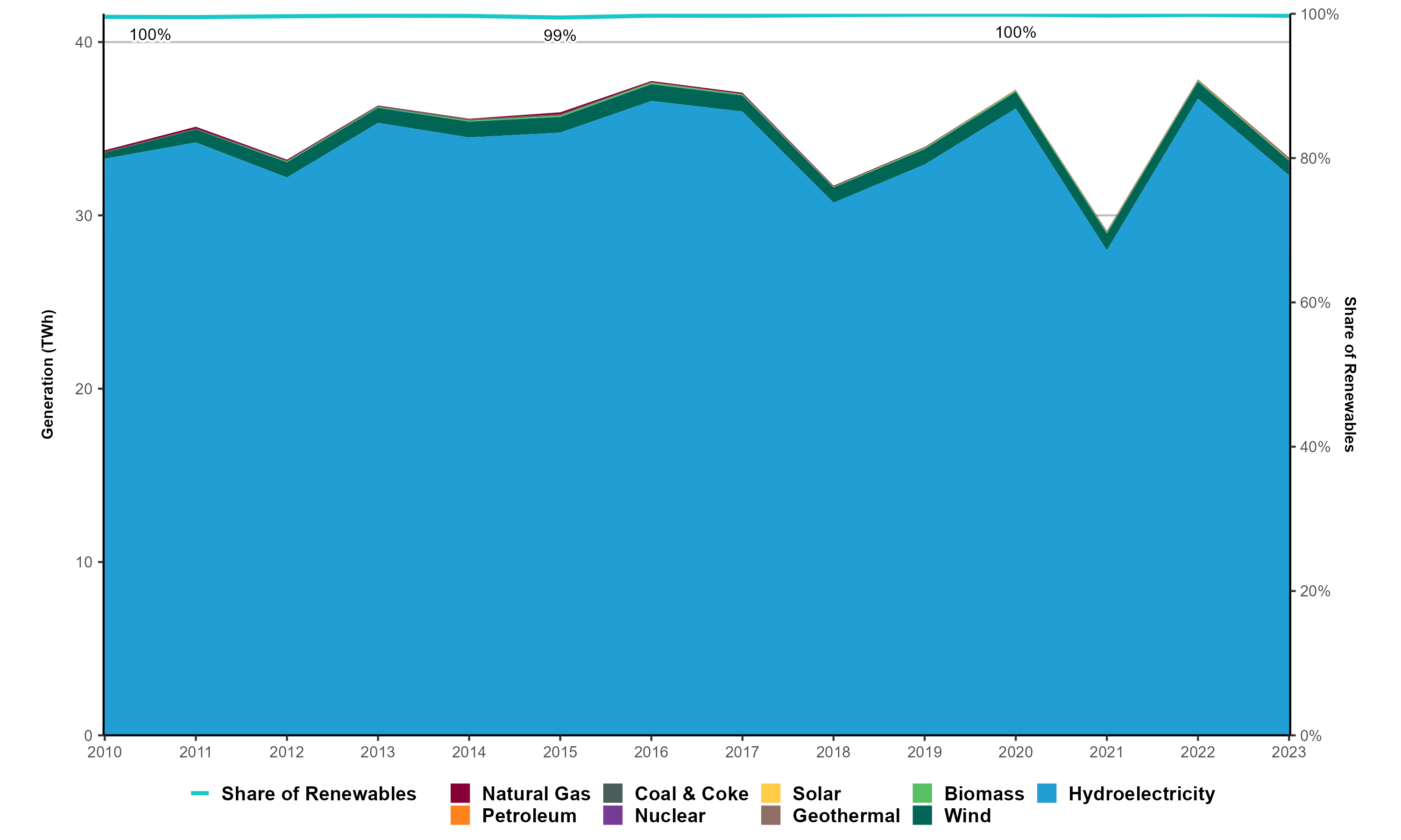Text Alternative: This graph illustrates electricity generation from 2010 to 2023 in Manitoba. In 2010, Manitoba’s total generation was 33.8 TWh (99.6% renewable). In 2023, total generation was 33.3 TWh (99.7% renewable). Most generation in 2023 came from hydroelectricity (96.9%) and wind (2.5%).