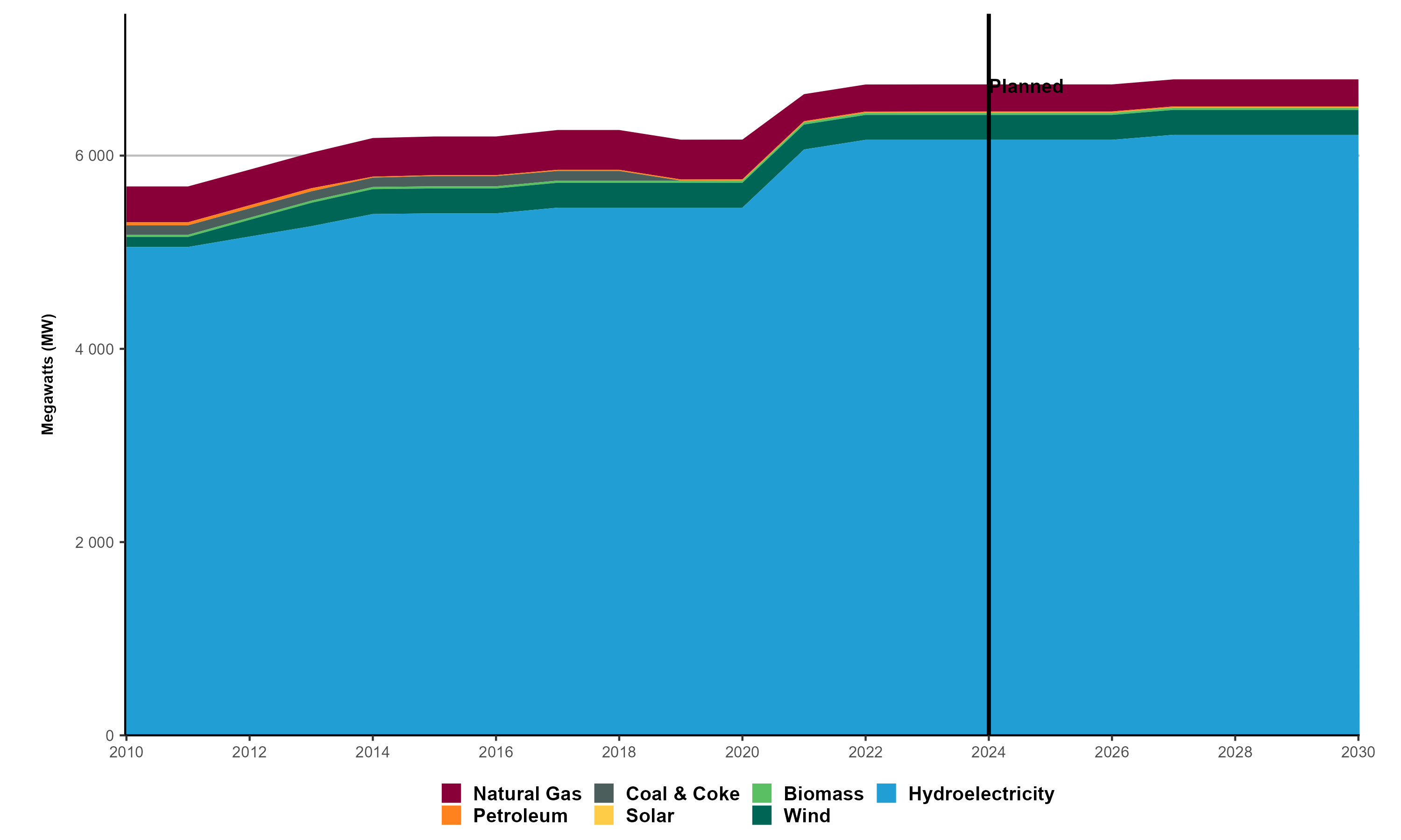 Text Alternative: This graph illustrates historical electricity generation capacity from 2010 to 2030 in Manitoba. In 2010, the province’s total installed electricity capacity was 5,681 MW (91.1% renewable). In 2023, capacity had grown to 6,737 MW (95.7% renewable). In 2030, based on planned capacity additions, capacity reaches 6,789 MW (95.7% renewable).