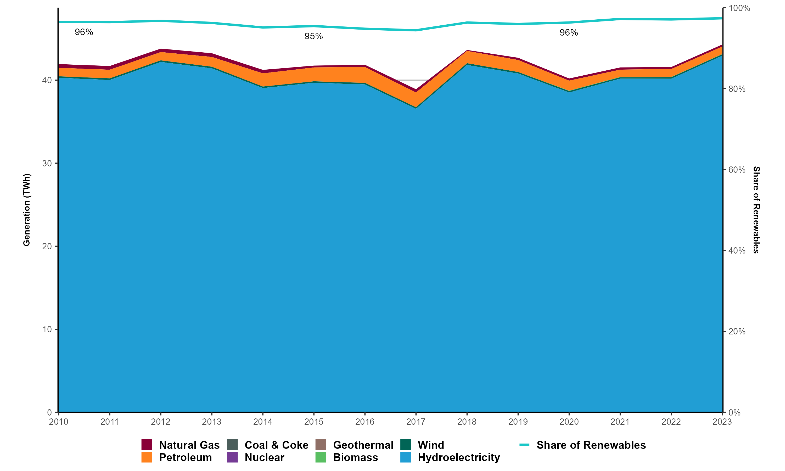 Other renewable sources play a marginal role in total generation. In 2023, wind contributed 172.3 gigawatt-hours (GWh) of electricity, or around 0.4% of total generation, and biomass contributed 20.5 GWh, or around 0.05% of total generation.