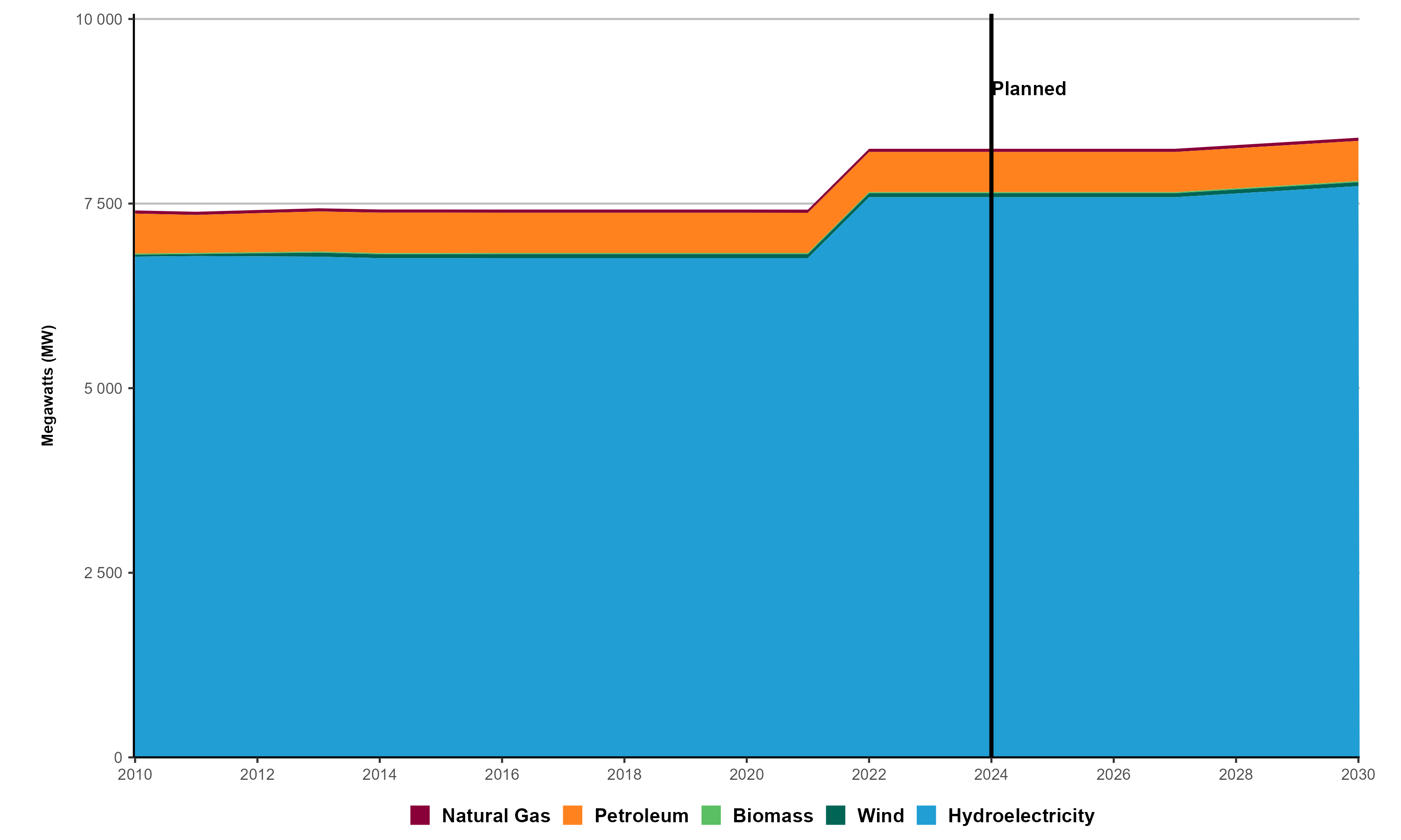 Text Alternative: This graph illustrates historical electricity generation capacity from 2010 to 2030 in Newfoundland and Labrador. In 2010, the province’s total installed electricity capacity was 7,407 MW (92.1% renewable). In 2023, capacity grew to 8,242 MW (92.9% renewable). In 2030, based on planned capacity additions, capacity reaches 8,392 MW (93.0% renewable).