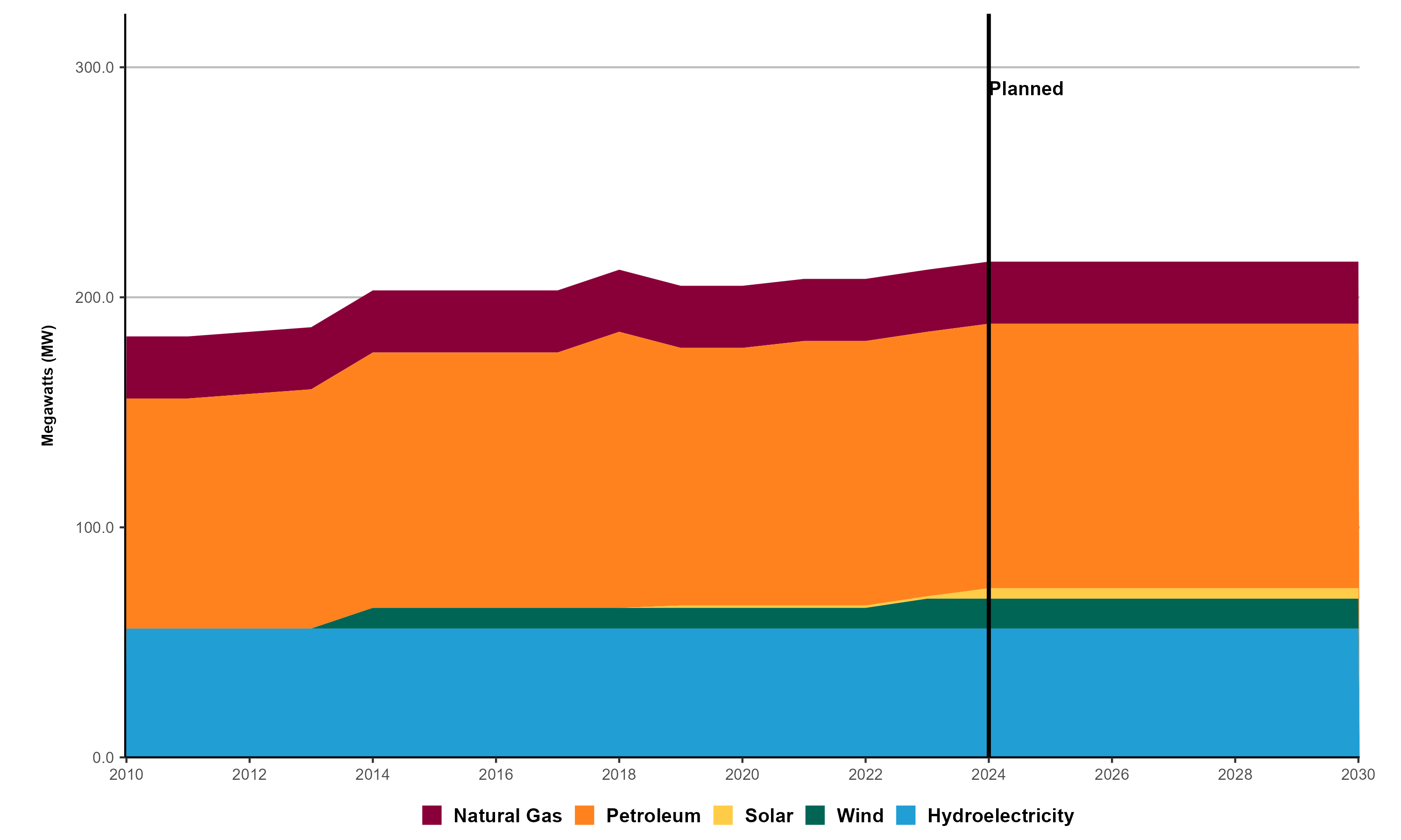 - Renewable capacity grew from 56 megawatts (MW) in 2010 to 70 MW in 2023, a 25.0% increase. This growth came from wind (13 MW) and solar (1 MW).