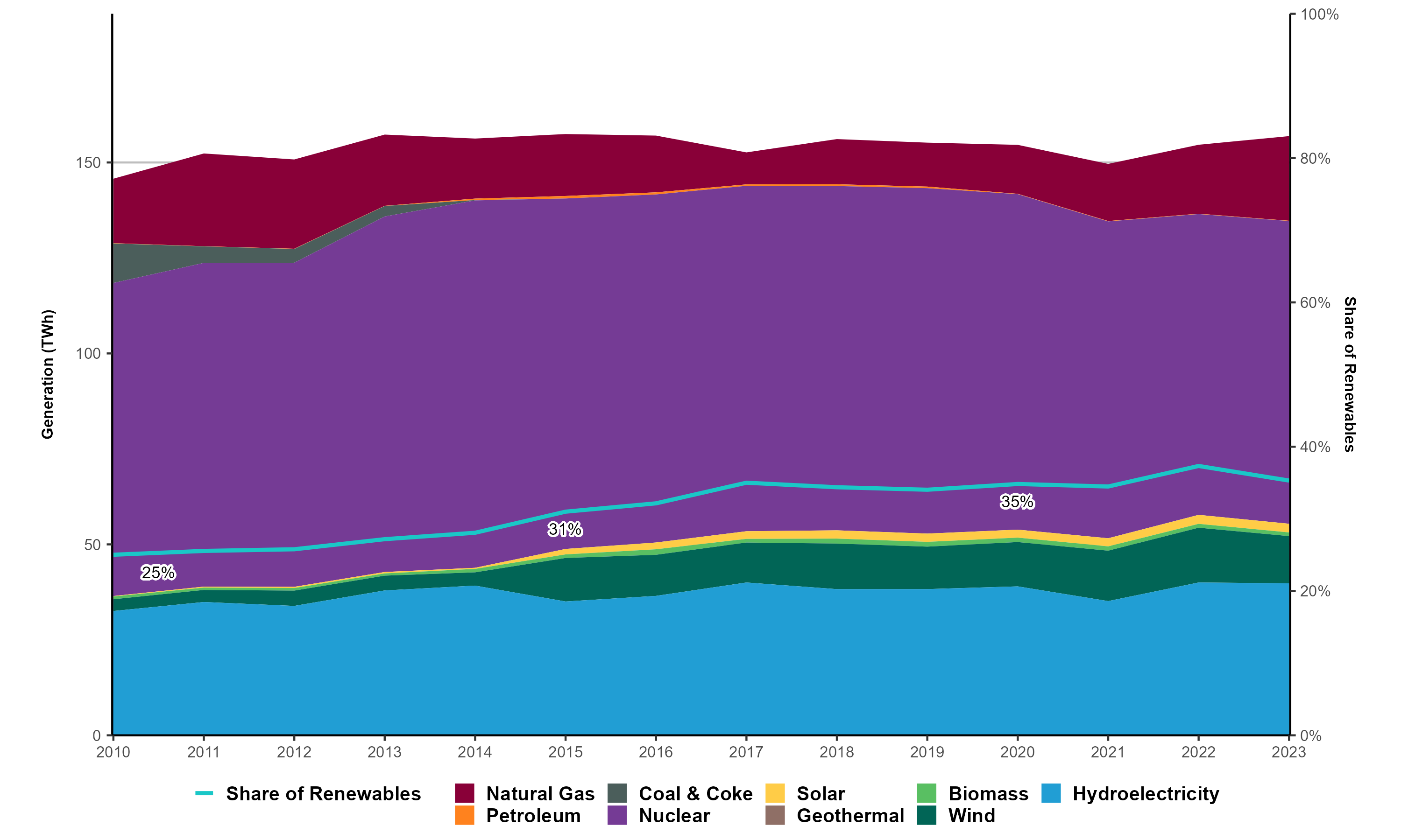 Text Alternative: This graph illustrates electricity generation from 2010 to 2023 in Ontario. In 2010, Ontario’s total generation was 145.7 TWh (25.0% renewable). In 2023, total generation was 156.9 TWh (35.3% renewable). Most generation in 2023 came from nuclear (50.5%), hydroelectricity (25.4%), natural gas (14.1%), wind (7.9%), and solar (1.4%).