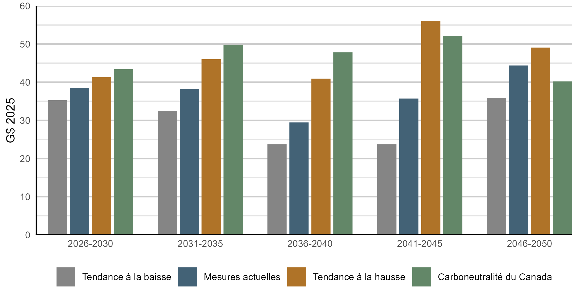 Version texte : Ce diagramme à barres illustre les investissements annuels moyens dans le réseau électrique au Canada dans tous les scénarios, par tranches de cinq ans, de 2026 à 2050. On constate que les investissements varient selon le scénario et au fil du temps. Dans toutes les tranches, les investissements sont les plus bas dans le scénario de la tendance à la baisse et les plus élevés, dans celui de carboneutralité du Canada et celui de la tendance à la hausse, et la taille des investissements change selon la période dans chaque scénario.