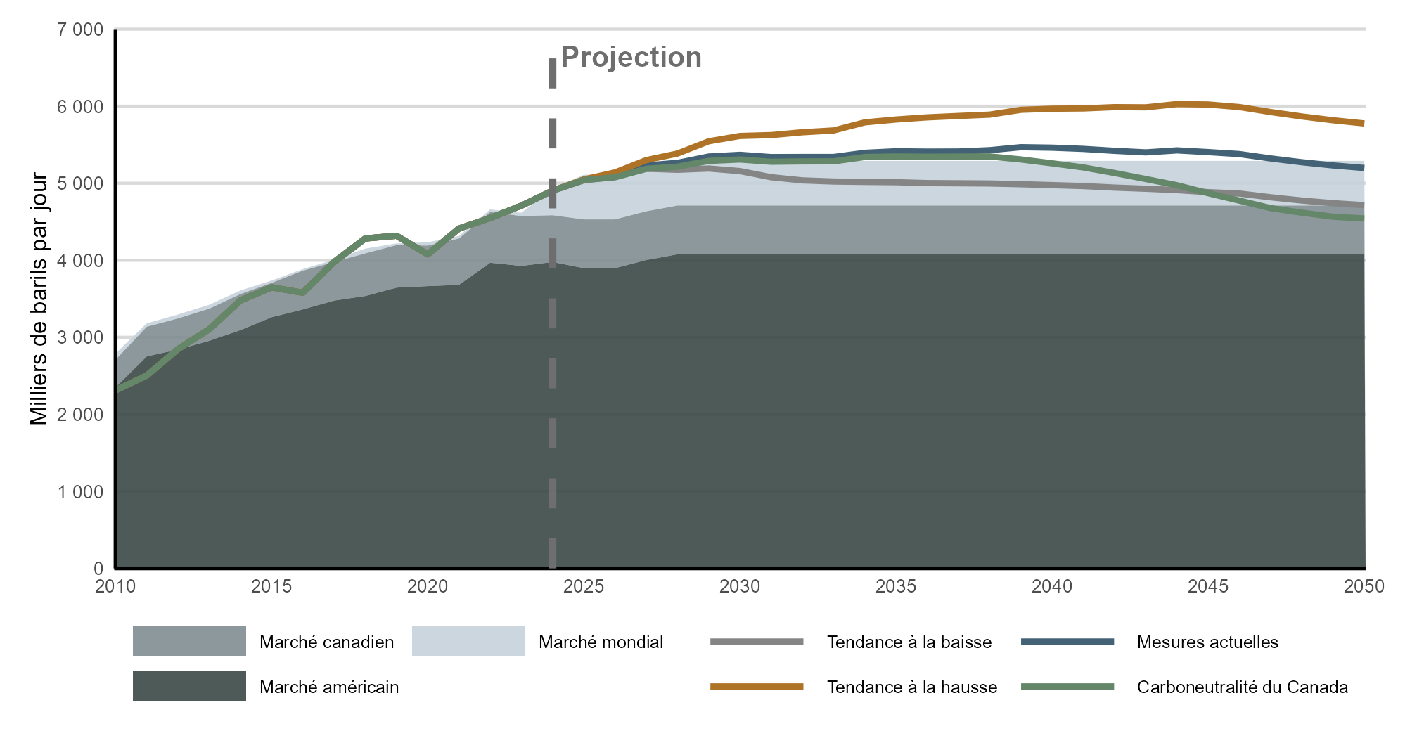 Version texte : Ce graphique illustre la capacité d’exportation hypothétique par pipeline et la capacité ferroviaire structurelle de transport de pétrole brut disponible à l’exportation depuis de l’Ouest canadien de 2010 à 2025, dans tous les scénarios. Les zones empilées représentent la capacité d’exportation vers les marchés intérieurs, les marchés américains et les marchés mondiaux. Les lignes indiquent l’offre totale disponible à l’exportation dans les scénarios de la tendance à la baisse, des mesures actuelles, de la tendance à la hausse et de carboneutralité du Canada. À mesure que le temps passe, la capacité d’exportation augmente pour ensuite se stabiliser. Quant à l’offre totale disponible à l’exportation, elle emprunte des trajectoires différentes selon les scénarios et divergent dans les dernières années de projection.