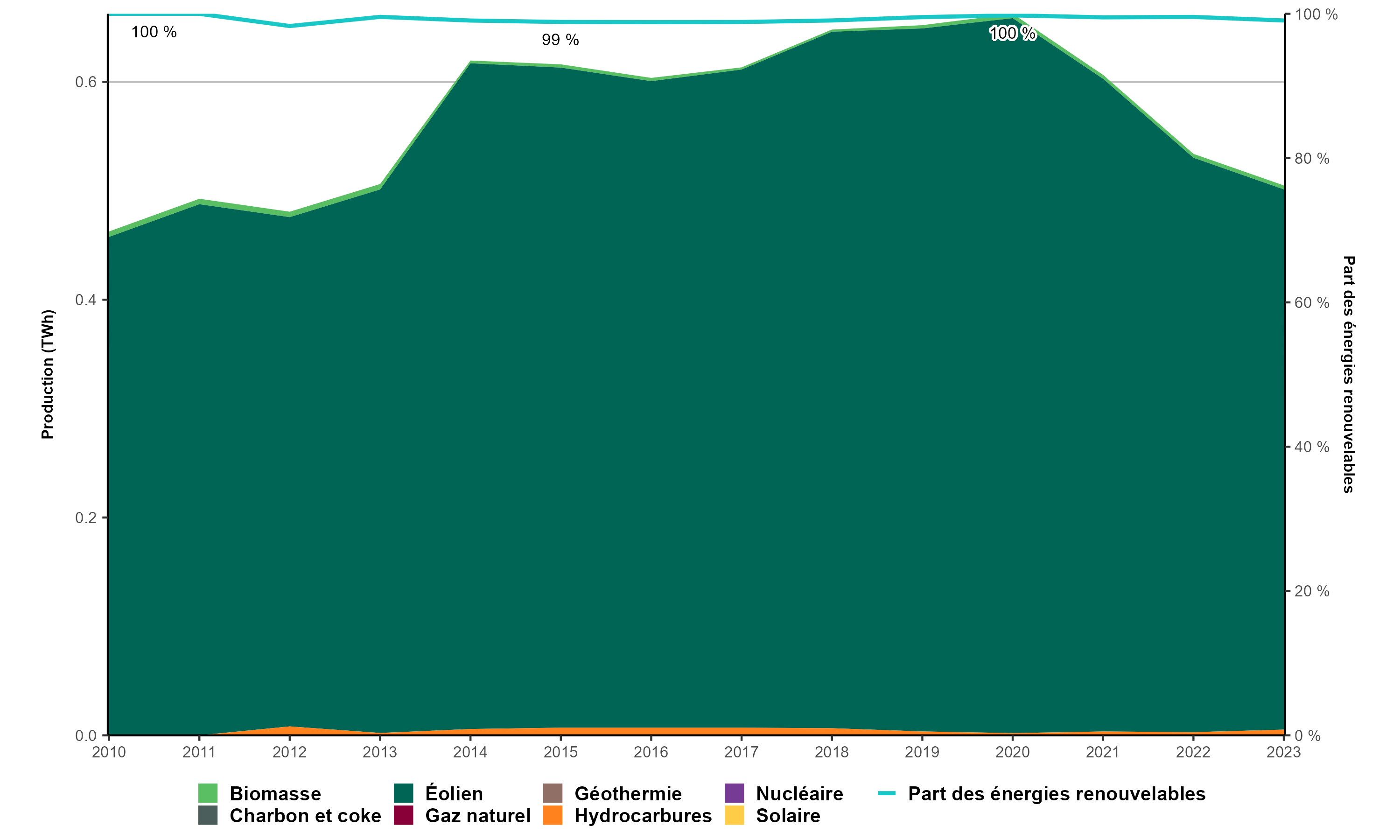 Version texte : Le graphique présente la production d’électricité à l’Île-du-Prince-Édouard de 2010 à 2023. En 2010, la production totale d’électricité de l’Île-du-Prince-Édouard s’établissait à 462,6 GWh (100,0 % à partir d’énergies renouvelables). En 2023, elle atteignait 504,9 GWh, dont 99,1 % provenant d’énergies renouvelables. La même année, la plus grande partie de la production provenait de l’éolien (98,2 %), du pétrole (0,9 %) et de la biomasse (0,7 %).