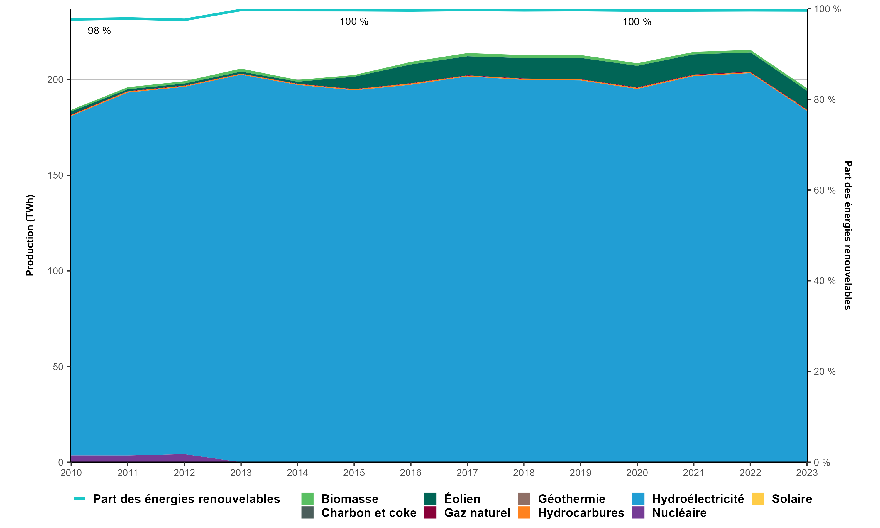 - En 2023, le Québec a produit 195,5 térawattheures (« TWh ») d’électricité, dont 194,8 TWh (99,6 %) provenant de sources renouvelables.