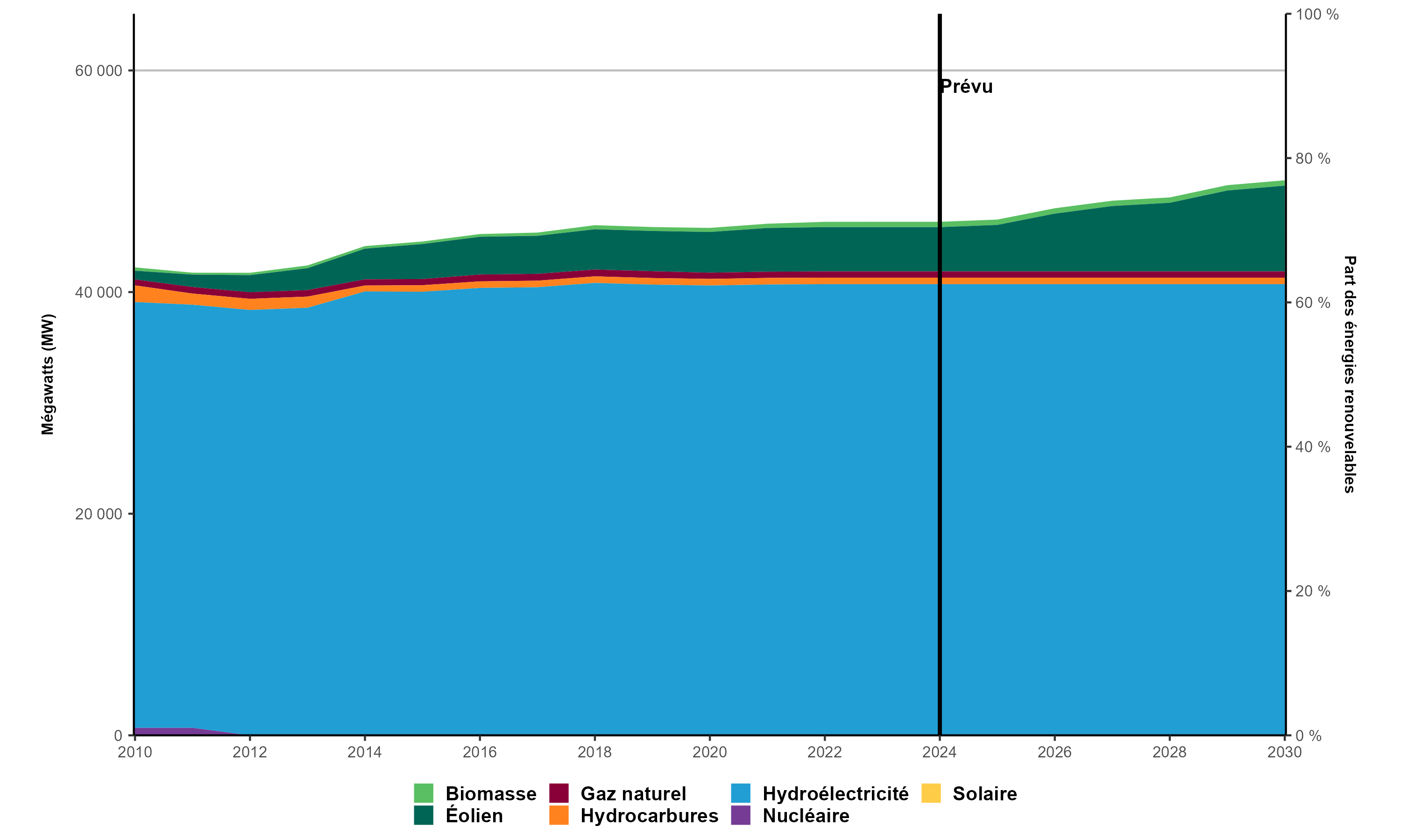 Version texte : Le graphique présente la capacité de production d’électricité au Québec de 2010 à 2030. En 2010, la capacité installée totale de production d’électricité de la province s’établissait à 42 230 MW, dont 94,0 % à partir d’énergies renouvelables. En 2023, cette capacité avait augmenté pour passer à 46 343 MW (97,5 % provenant d’énergies renouvelables). Selon les ajouts prévus, la capacité devrait atteindre 50 088 MW (97,7 % à partir d’énergies renouvelables) en 2030.