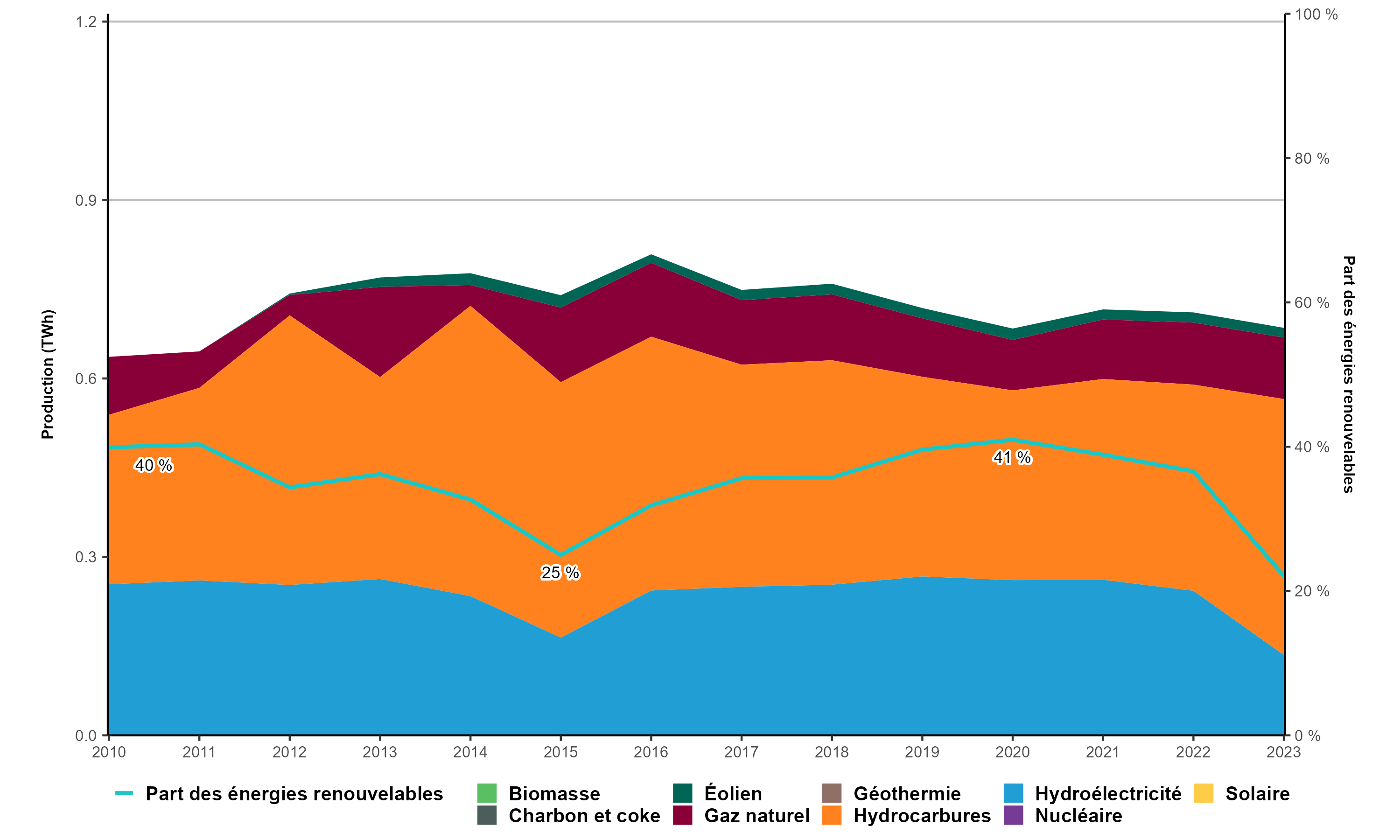 - La capacité de production à partir d’énergies renouvelables est passée de 56 mégawatts (« MW ») en 2010 à 70 MW en 2023, soit une augmentation de 25,0 %, principalement attribuable à l’éolien (13 MW) et à l’énergie solaire (1 MW).