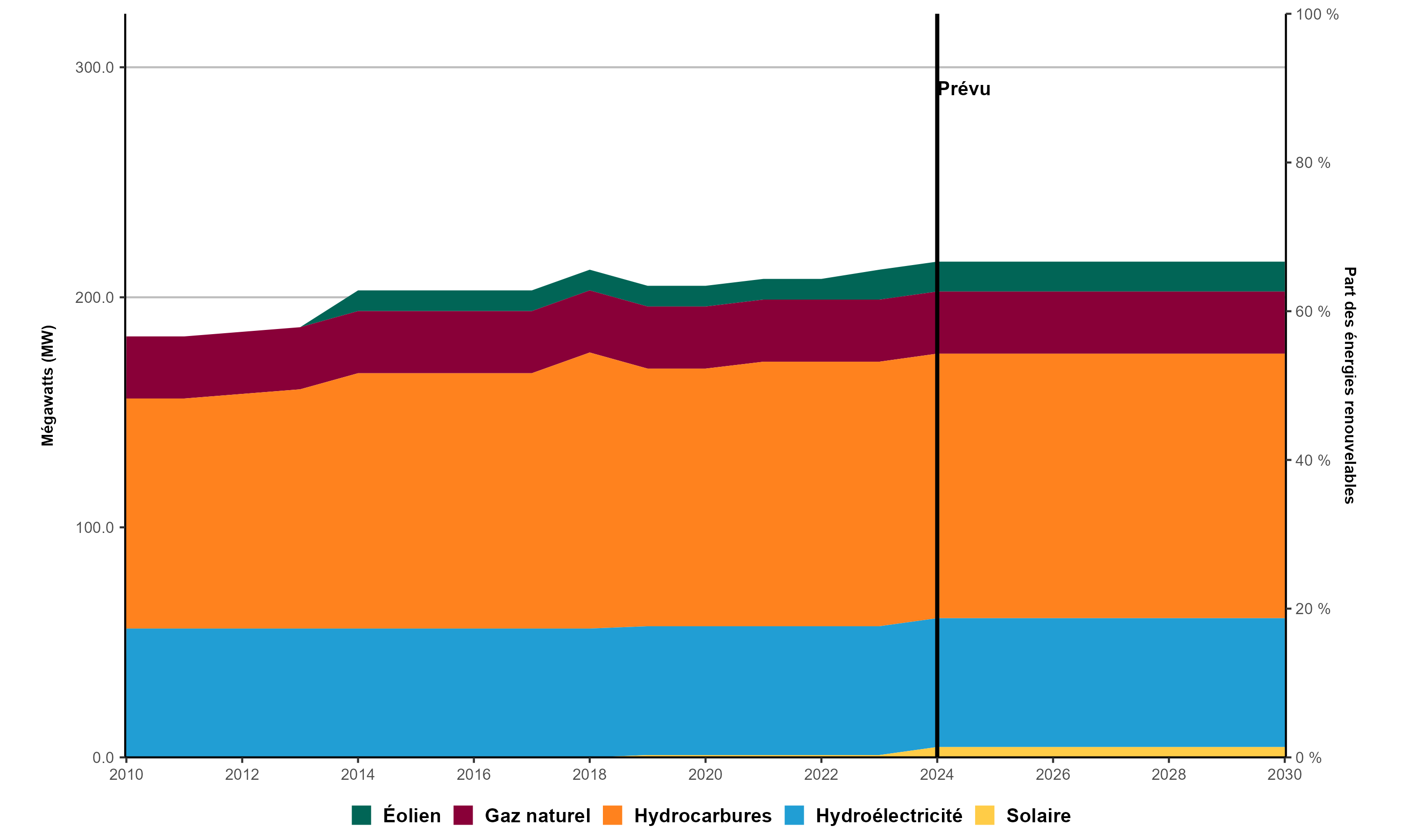Version texte : Le graphique présente la capacité de production d’électricité dans les Territoires du Nord-Ouest de 2010 à 2030. En 2010, la capacité installée totale de production d’électricité de la province s’établissait à 183 MW, dont 31,0 % à partir d’énergies renouvelables. En 2023, elle a atteint 212 MW (33,0 % d’énergies renouvelables). Selon les ajouts prévus, la capacité devrait atteindre 216 MW (34,1 % à partir d’énergies renouvelables) en 2030.